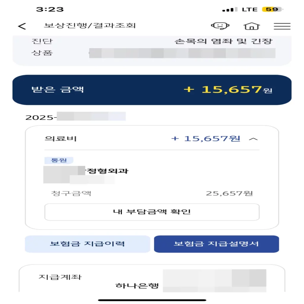 염좌의 경우 의료보험이 적용돼서 실비 보험을 청구할 수 있었어요. 보조기 비용에도 적용됩니다. 총치료비용은 25,657원 발생했고요.