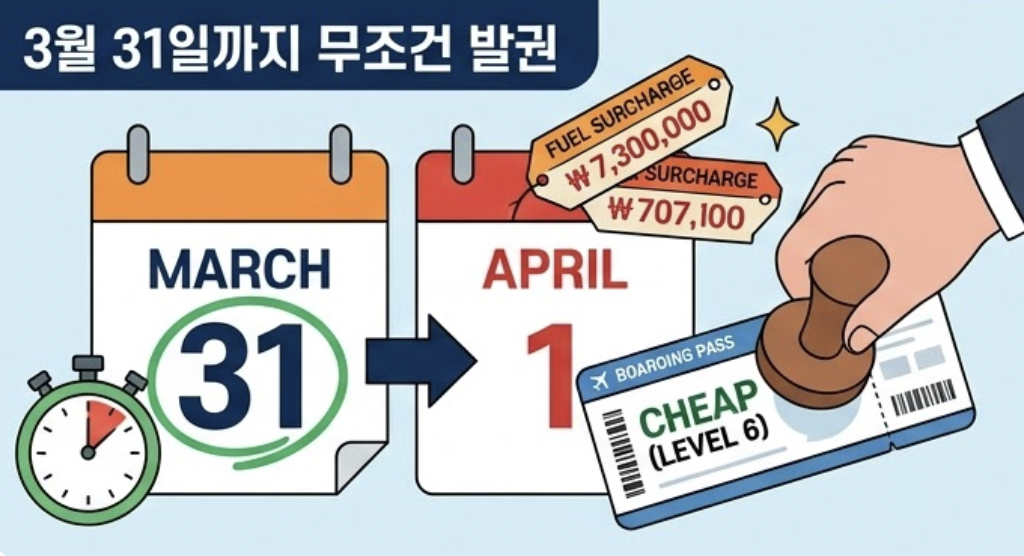 - 예를 들어 6월 10월에 떠나는 여행이라도 3월 31일 밤 11시 59분 전에 항공권 발권을 완료하면 지금의 저렴한 3월 유류할증료(6단계)를 적용받습니다.